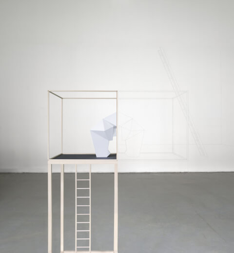 Installation et dessin mural, papier, bois, graphite sur mur blanc, dimensions variables / Photographie résultante, tirage sur papier mat, 64x60 cm.